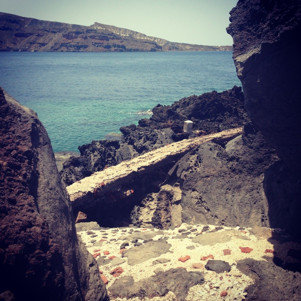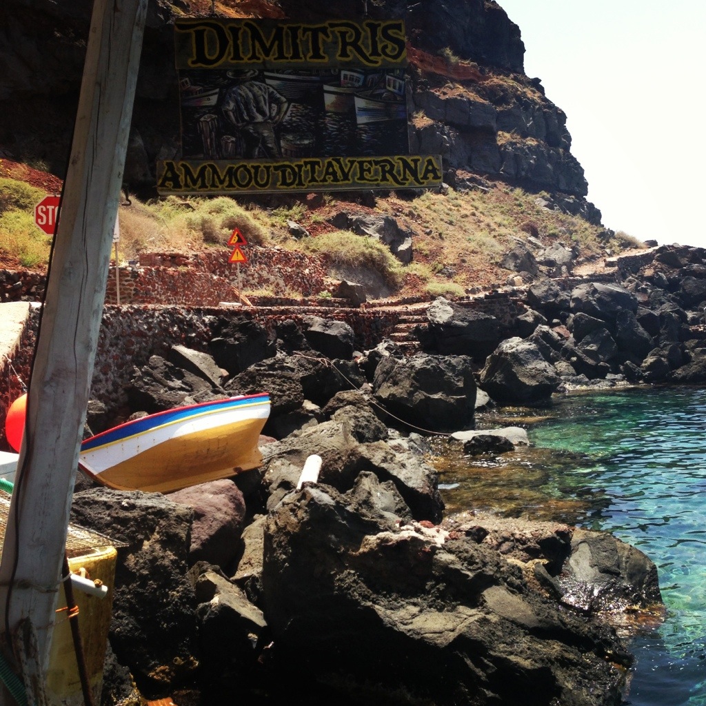 Although traffic is lighter during the day, I decided to bypass the town perched high on the cliff and head for the seaside town of Amoudi Bay, which is located beneath Oia (for those who aren’t on wheels there is a set of 300 often slippery steps from Oia which take about 20 minutes to descend).