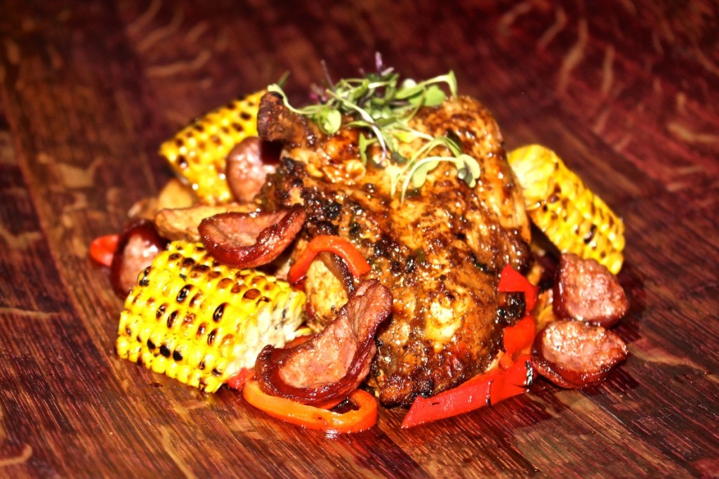Chicken breast with kipfler potato, chorizo, burnt corn, capsicum, parsley, churmoula and jus.