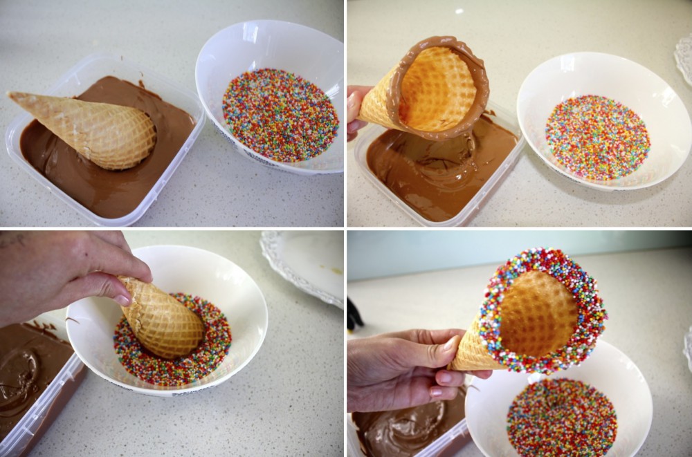 I couldn’t resist making these cool cones topped with melted chocolate and sprinkles. I even had a go at crushed nuts, but they didn’t seem to stick so well.