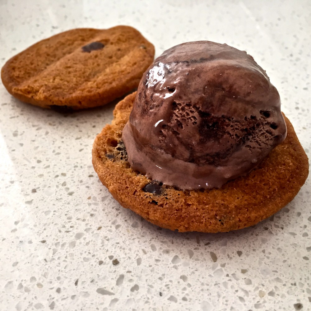 Turns out, it’s actually easier to cut your tub into slices and then peel the tub off the ice-cream once it’s in the cookie. Or you can do what I did and just drop on scoops of you preferred flavour and then squish!