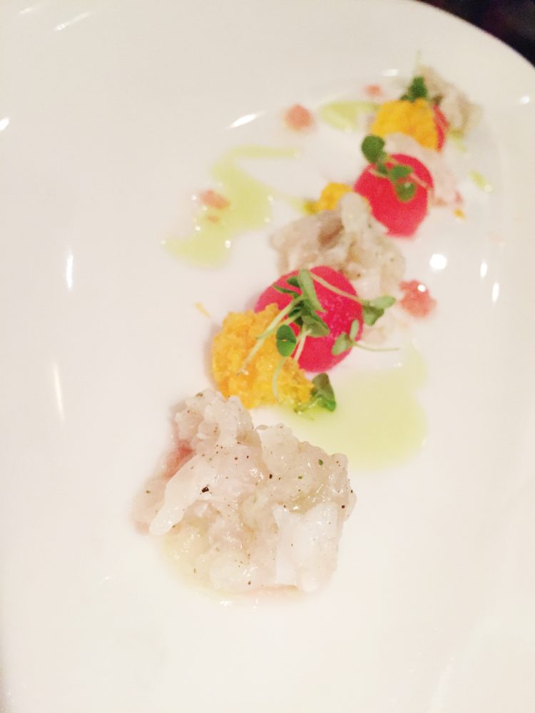 Strawberry gum cured crocodile cerviche served with finger lime dressing, watermelon, micro basil and freeze dried mandarin.