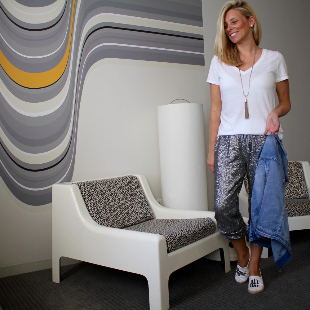 Gap t-shirt | Bohemian Traders sequin pants (now on sale!)| Flower denim jacket | Circus by Sam Edelman shoes
