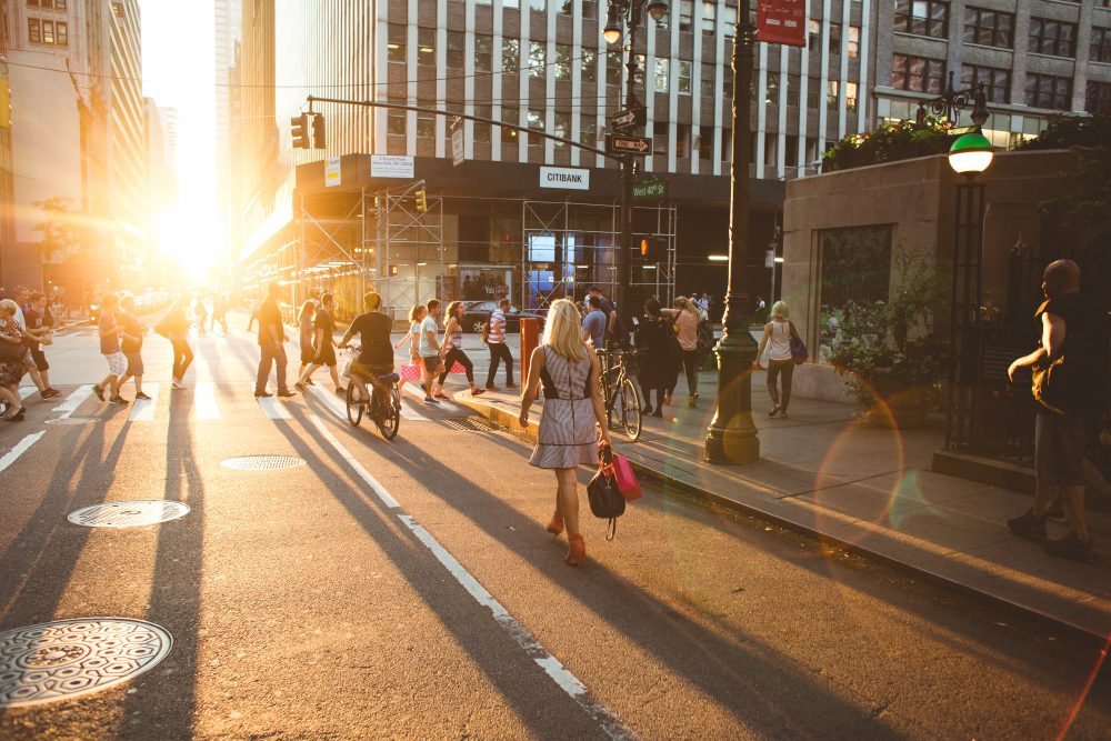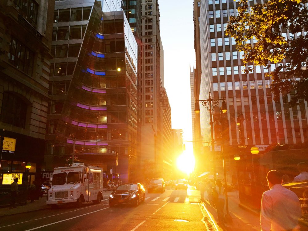 Twice a year, the setting sun aligns precisely with the east-west streets of Manhattan’s street grid system creating a glow of light throughout the concrete jungle and creating a ball of light between buildings.
