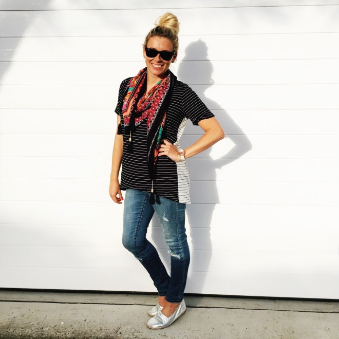 Ruby & Lilli Tidal tee | Witchery jeans | Gregory Ladner scarf | Seed Heritage shoes | Klasse 14 watch | Ray-Ban sunglasses (worn with an oversized Witchery cardigan)