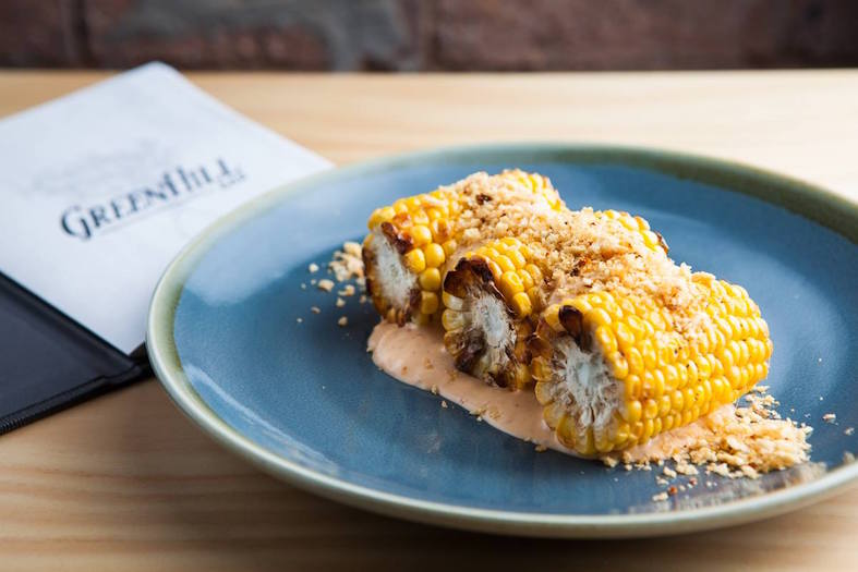 Charred corn on the cob with Crispy pork crumb and spicy buttermilk remoulade. Photo: Judit Losh