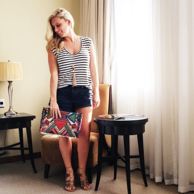Saturday | Witchery tee | Cotton On shorts | Seed Heritage necklace | Rubi sandals | Clutch from The Clutch