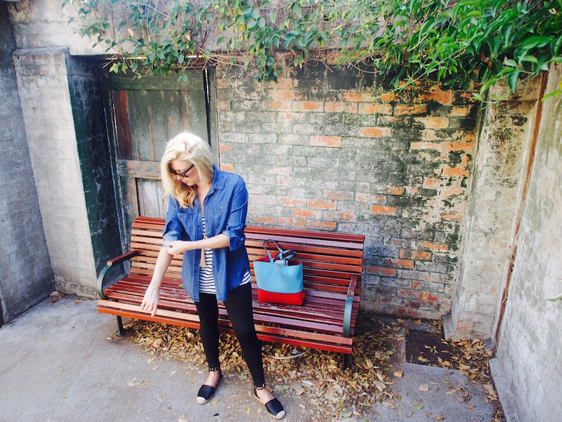 Active Truth Ultimate Full Length Tights in black | Witchery striped tee, denim shirt and espadrilles | Seed Heritage necklace | Bag Trader neoprene tote | Ray-Ban Wayfarers