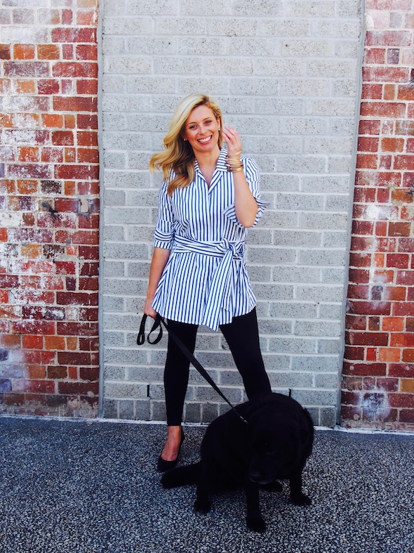 Active Truth Ultimate Full Length Tights in black | Country Road black singlet | Witchery Striped Shirt | Nine West heels