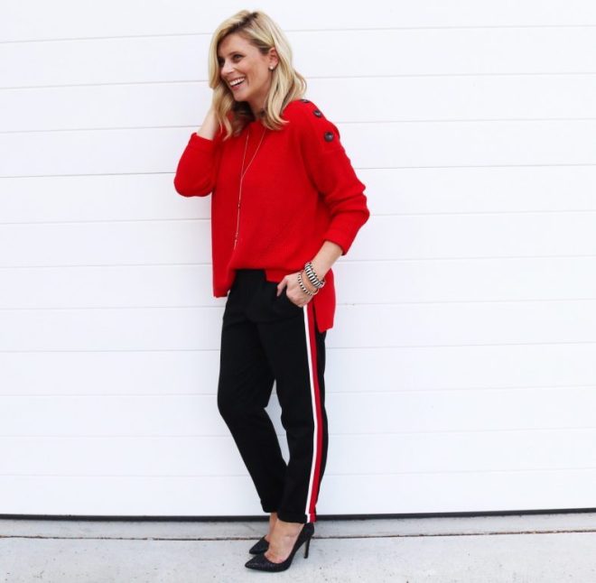 A pair of classic cigarette-style black work pants have been given a sporty update at Zara with this red side stripe. They’re great for weekend wear when teamed with a tee and trainers, but also fantastic for the office (as I’ve done here) wit this red knit and a pair of great heels.