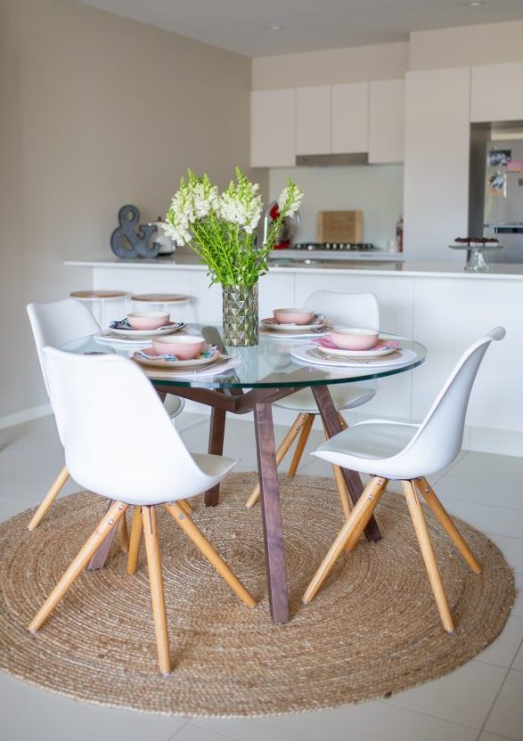 Sean Dix Molly Round Glass Dining Table || Replica Eames Premium DSW Side Chair in Plastic || Almond Round Rug