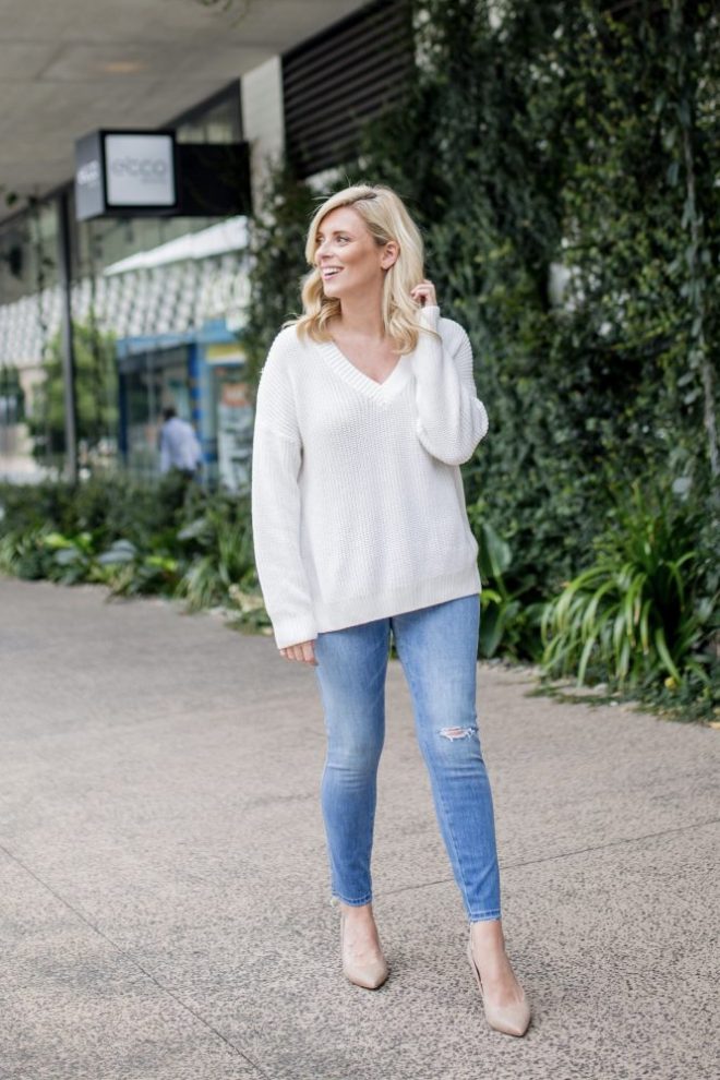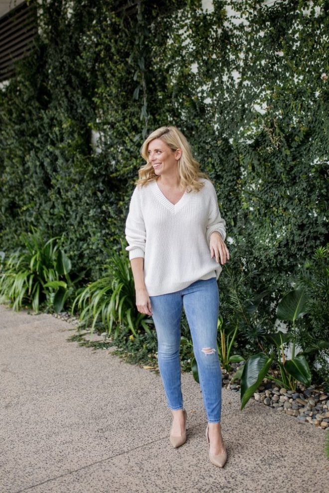 Wearing: Courtney V-Neck Pullover, $29.99 | 360 Repreve Mid Waist Skinny Ankle, $139.99