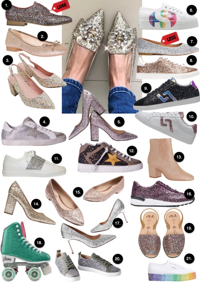 1. Raglin Pink Glitter, $475 || 2. Zabelle Sparkle Ballet, $119.95 || 3. ASOS DESIGN Wide Fit Sammy slingback mid heels in glitter, $50 || 4. Zoe Kratzmann Wave, $289 || 5. Orchestra Pump Heels (Grey Sky), $199 || 6. Superga Womens 2790-COTW Printed Logo Glitter, $49.99 || 7. ASOS DESIGN Lucky pointed ballet flats in silver glitter, $28 || 8. Astro Sneaker, $199 || 9. Prime Black Glitter, $209.95 || 10. Prime White Pink Glitter, $209.95 || 11. STEViE in White/Silver Glitter, $239.95 || 12. Zoe Kratzmann Distil, $299 || 13. Adorabelle Sparkle Boot, $199.95 || 14. Orchestra Pump Heels (light gold), $199 || 15. Orchestra Ballet Flats (Rose Gold), $179 || 16. Twyla Sneaker, $199 || 17. Carve Glitter Pump Heels (Silver), $199 || 18. Crazy Skates Disco Glam, $169.95 || 19. Avarcas Multi Glitter Gold, $110 || 20. Harlow Leather Sneaker, $119.95 || 21. Superga 2790 Cotw Sneakers, $129.95 ||