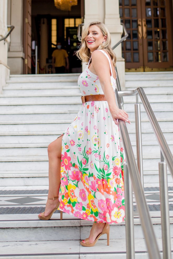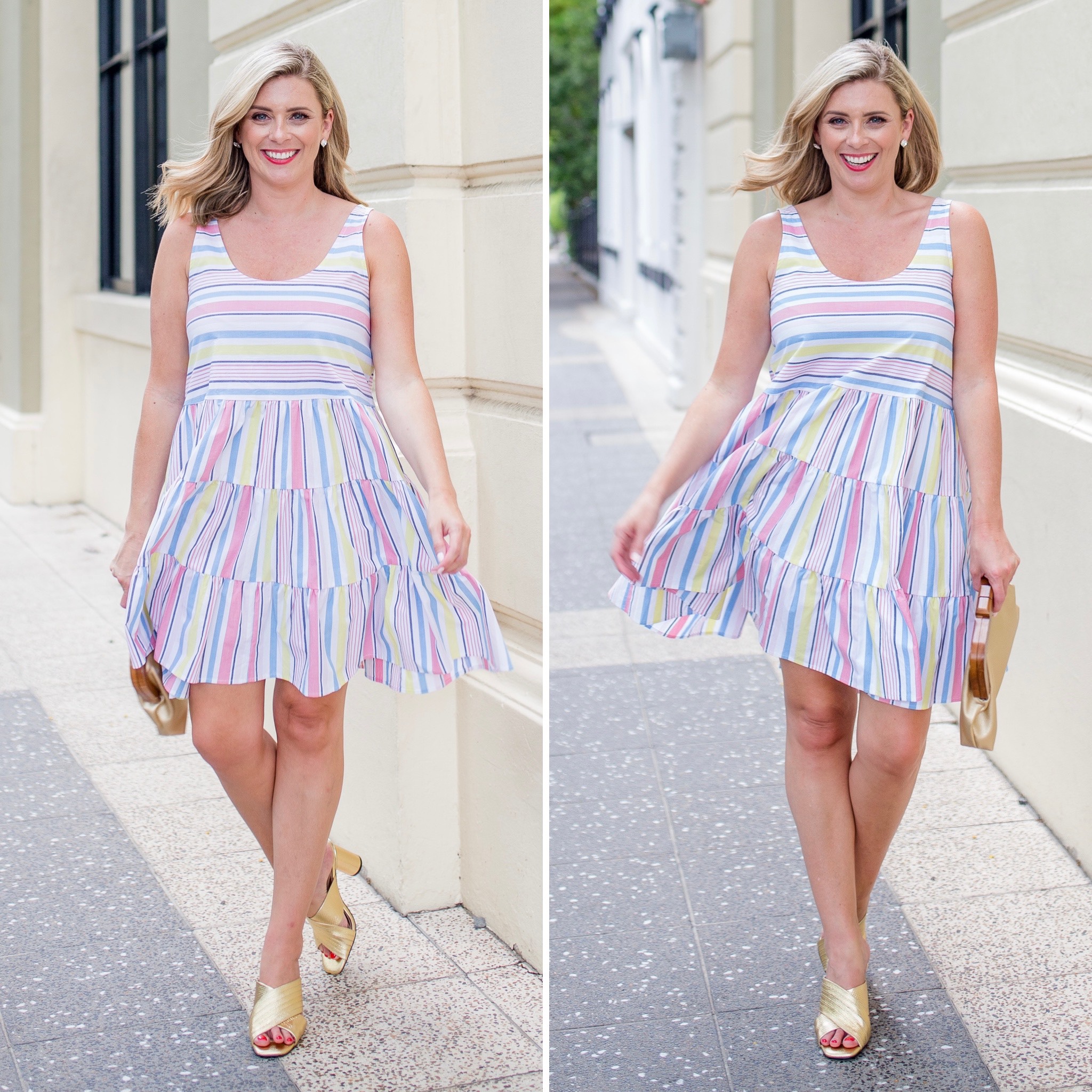 Wearing: Winifred Midi Dress in Pink/Navy Stripe