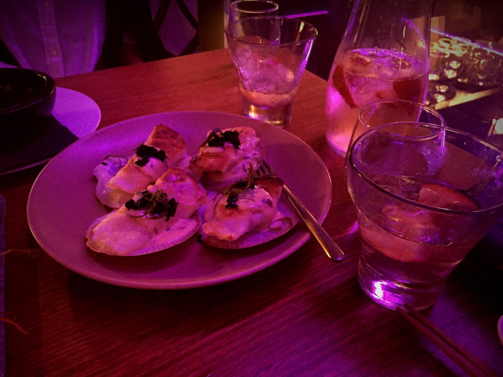 Pan fried scallop dumplings, verjus butter, black tobiko.