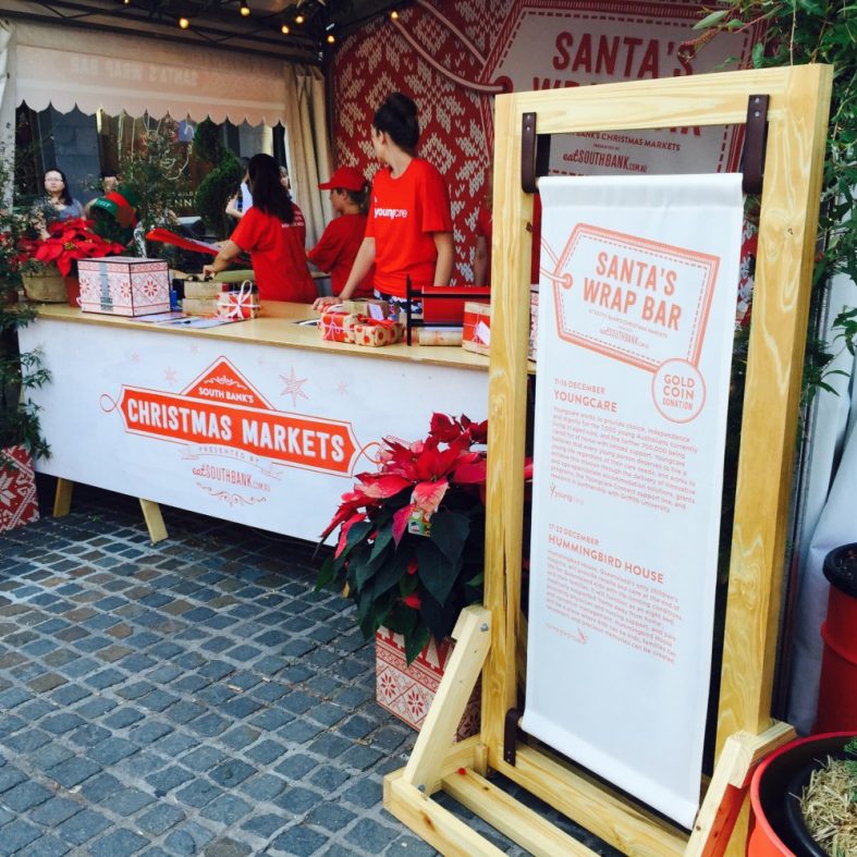 Gift wrapping for a gold-coin donation with donations going to Youngcare and Hummingbird House.